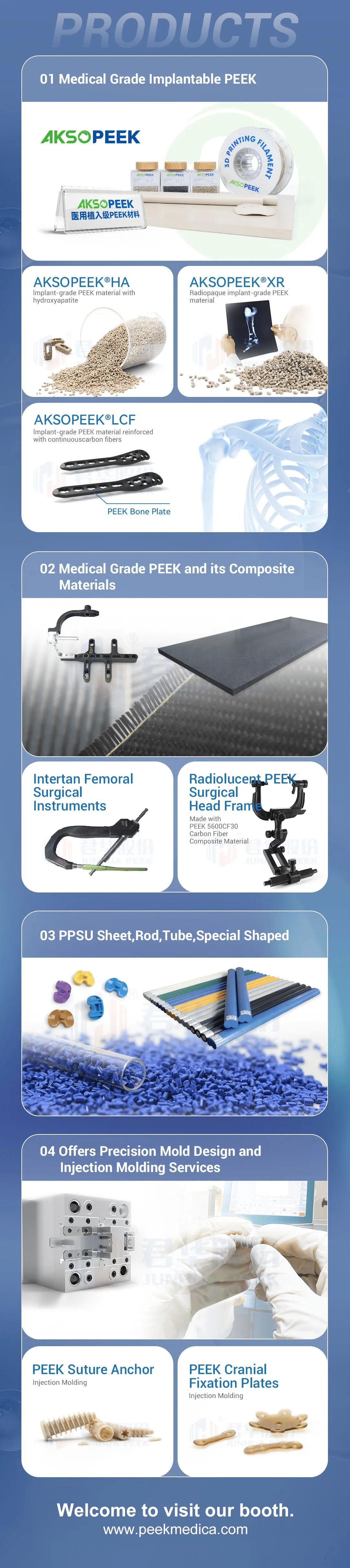 Bu sergide Junhua, AKSOPEEK tıbbi sınıf PEEK malzemeleri, tıbbi sınıf PEEK ve kompozit plakaları, intramedüller çivi yönlendirme cihazları ve diğer cerrahi aletlerin yanı sıra tıbbi sınıf PPSU malzeme plakaları, çubukları ve parçalarını getiriyor. AKSOPEEK tıbbi sınıf PEEK malzemelerinden oluşan bir dizi ürüne odaklanacağız; bunlar arasında AKSOPEEK granüller, plakalar, çubuklar ve AKSOPEEK 3D baskı filamentleri bulunuyor. Özel olarak sergilenen ürünler arasında PEEK kemik plakaları, PEEK kafatası onarımları ve PEEK sternum kayışları gibi ortopedik ürünlerin yanı sıra PEEK perçinler gibi spor hekimliği ürünleri de yer alacak.