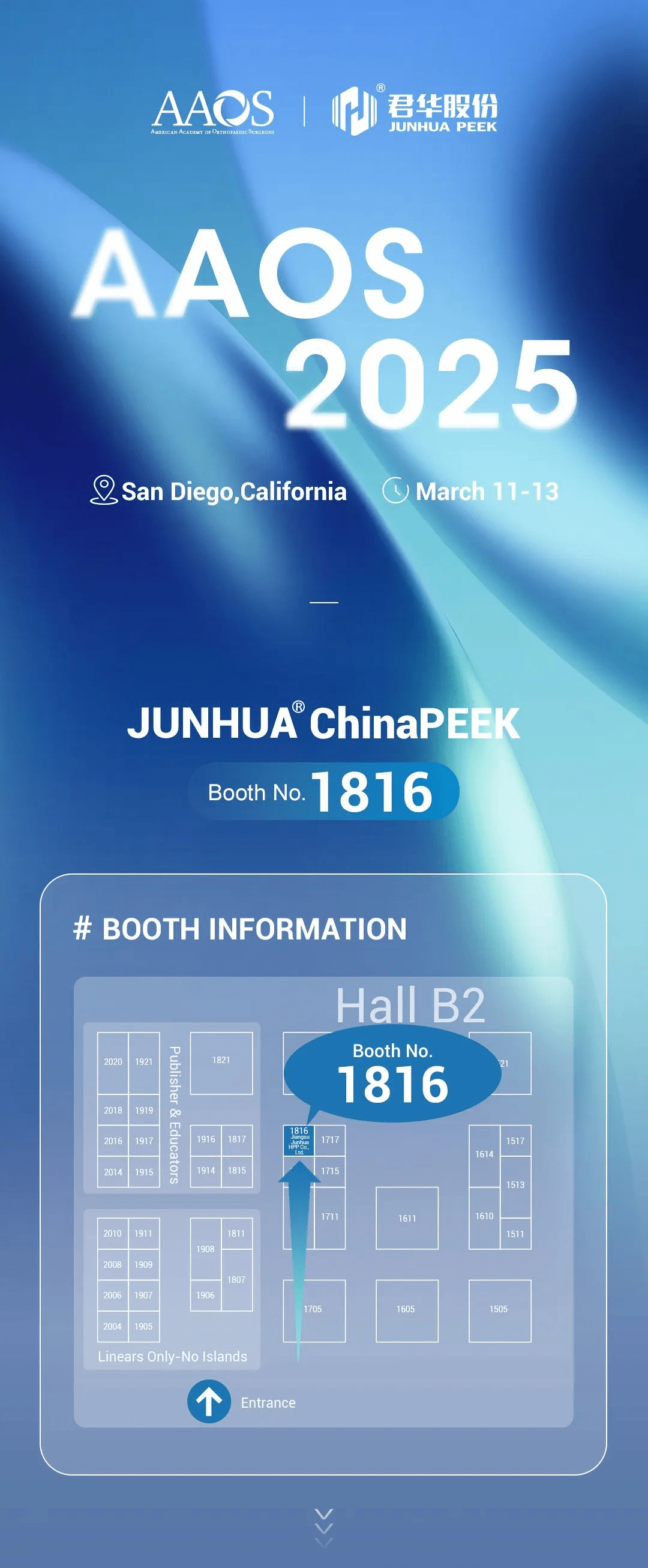 Junhua Medical, PEEK’in tıbbi uygulama alanında 18 yıldır derinlemesine faaliyet göstermekte olup, AKSOPEEK serisi tıbbi implant malzemelerini başarıyla geliştirmiştir. AKSOPEEK tıbbi sınıf PEEK malzemelerinin üretim sürecinin tamamı, reçine polimerizasyonundan, saflaştırmaya, peletlemeye ve ekstrüzyona kadar her aşamada bizim tarafımızdan tam olarak kontrol edilmekte ve katı kalite kontrolü sağlanmaktadır. 2024 yılında ürünlerimiz ASTM F2026 ve YY/T0660-2008 gibi sertifikaları geçmiş, FDA MAF ana dosya kaydını tamamlamış ve NMPA tarafından verilen ilk Sınıf III implant PEEK uygulama kayıt sertifikasını almıştır. Ürünlerimiz, nöroşirürji, ortopedi, kardiyovasküler alanlardaki tipik PEEK uygulamalarını kapsamakta ve yerel pazarda takdir kazanmıştır. Ayrıca Türkiye, Meksika, Amerika Birleşik Devletleri ve Brezilya gibi ülkelere başarıyla ihraç edilmiştir. ChinaPEEK yavaş yavaş dünyaya açılıyor. Bizi AAOS 2025’te Junhua’nın B2 1816 numaralı standında ağırlamaktan memnuniyet duyarız. Ortopedi alanının geleceğini sizinle birlikte görmeyi dört gözle bekliyoruz!