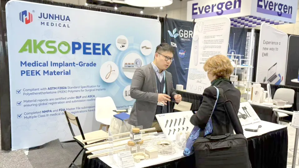 Çin’in yerli olarak geliştirilmiş implant sınıfı PEEK malzemelerinde bir öncü olarak Junhua, yenilikçi ürününü sergiledi—AKSOPEEK Medikal İmplant Sınıfı PEEK Malzemeetkinlikte. Şirket kapsamlı biruçtan uca çözümAKSOPEEK peletler, levhalar, çubuklar ve 3D baskı filamentlerinden bitmiş bileşenlere kadar uzanan geniş yelpaze.